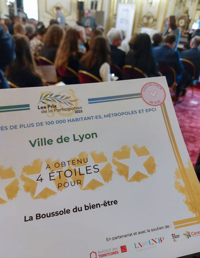 L’ambition de la Ville de Lyon de faire du bien-être une boussole pour l’action publique a été récompensée le 21 novembre 2025 par le think tank Décider ensemble qui a attribué 4 étoiles et la mention « Coup de cœur du jury » à la Boussole du bien-être.